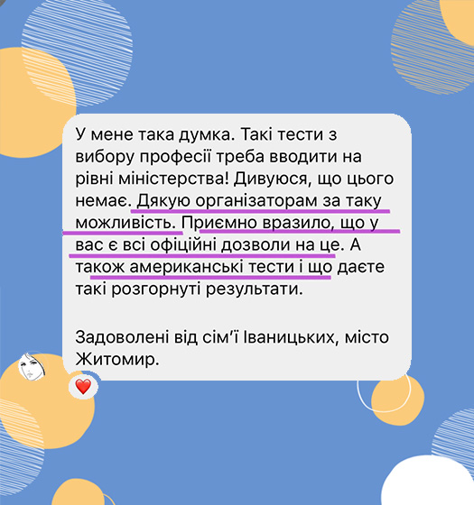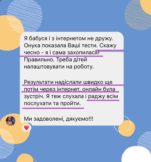 Результати всіх тестувань учасники та їх батьки отримують у форматі PDF в свій Telegram.