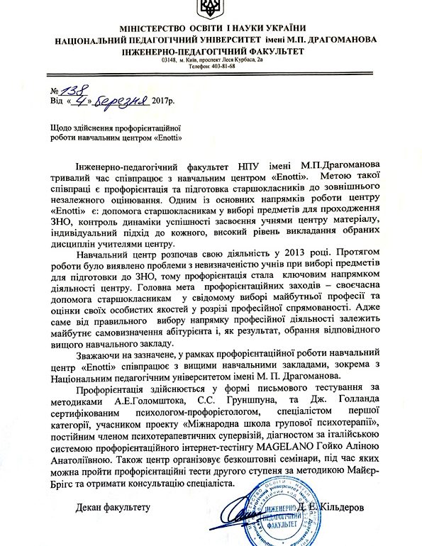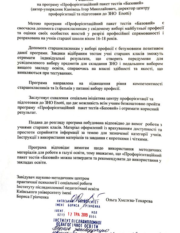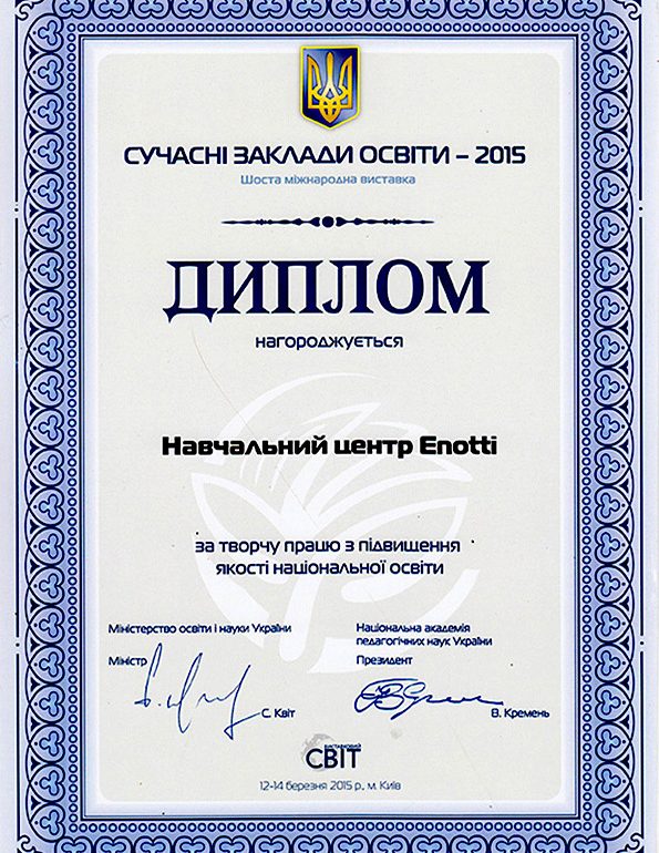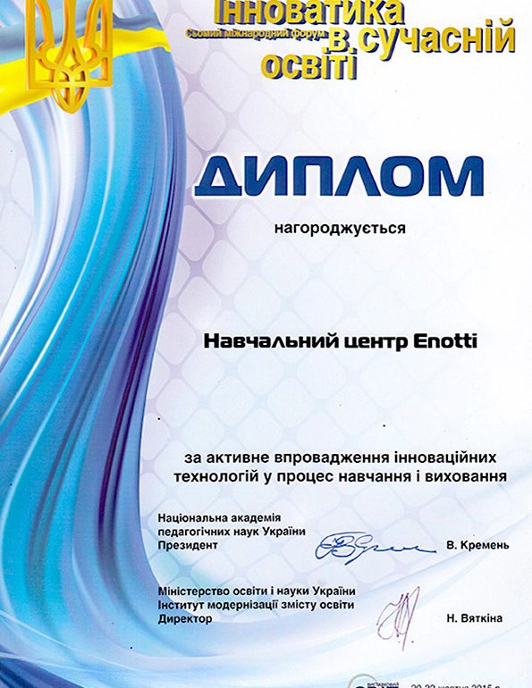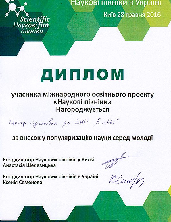 Навчальний центр Enotti заснований в 2013 році, займається підготовкою до ЗНО (НМТ) та профорієнтацією. За цей час ценрт підготував більше ніж 2000 учнів з середнім результатом 180-185 балів.