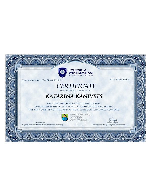 Катаріна – викладачка з 15 річним досвідом, тьюторка (міжнародна сертифікація), співзасновниця Навчального центру Enotti, авторка блогу та розвиваючих програм для матусь. Закінчила КНУ імені Тараса Шевченка, Міжнародну академію тьюторингу. Обожнює подорожувати, відвідала 25 країн світу. Кредо – нічого не бійся, за твоєю простою дією криються мільйони можливостей.